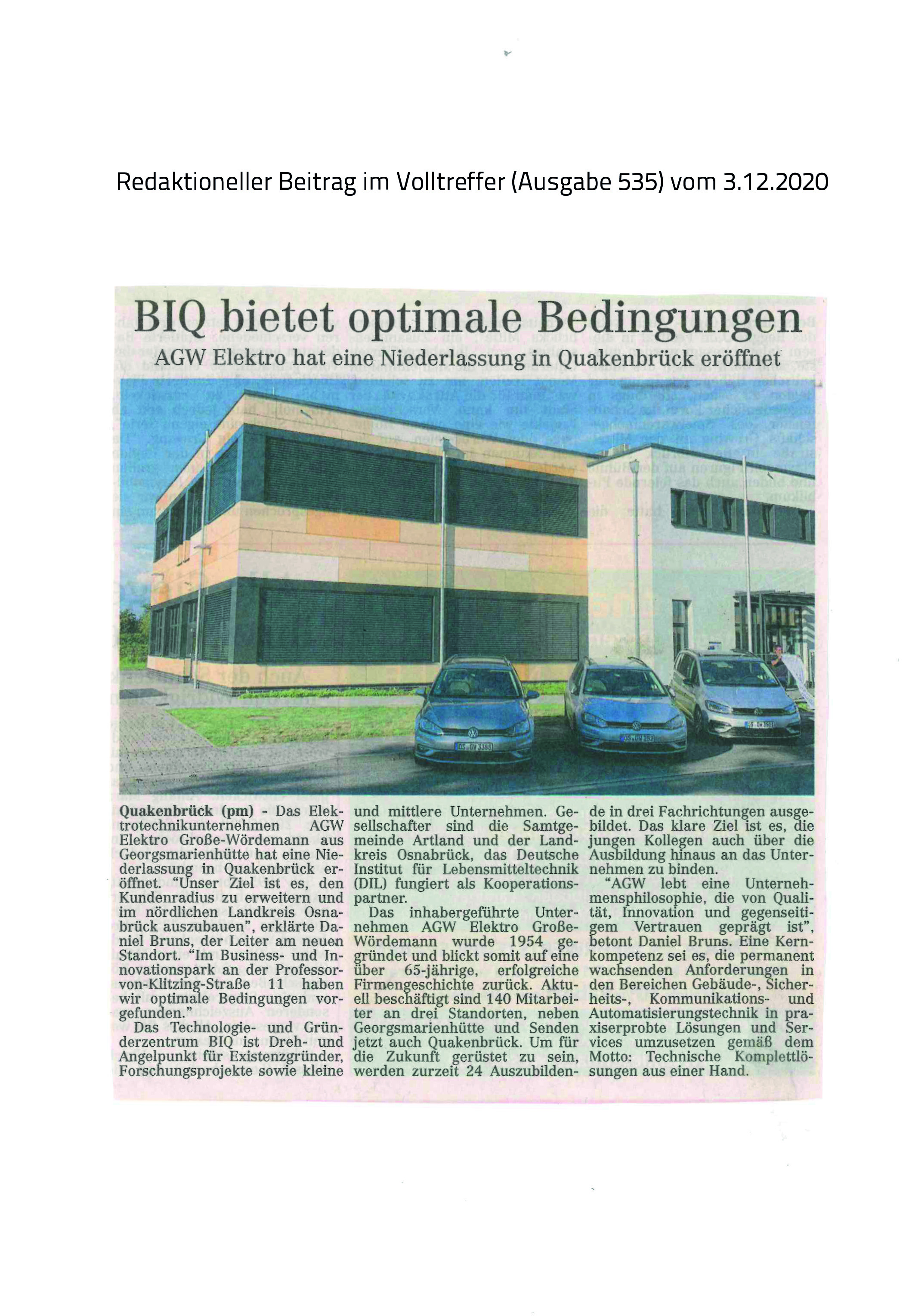 Der Volltreffer - die Lokalzeitung für den nördlichen Landkreis Osnabrück, das Oldenburger Münsterland und einem Teil des Emslandes - veröffentlichte am 3.12.2020 folgenden Artikel: "BIW bietet optimale Bedingungen - AGW Elektrotechnik hat eine Niederlassung in Quakenbrück veröffentlicht."